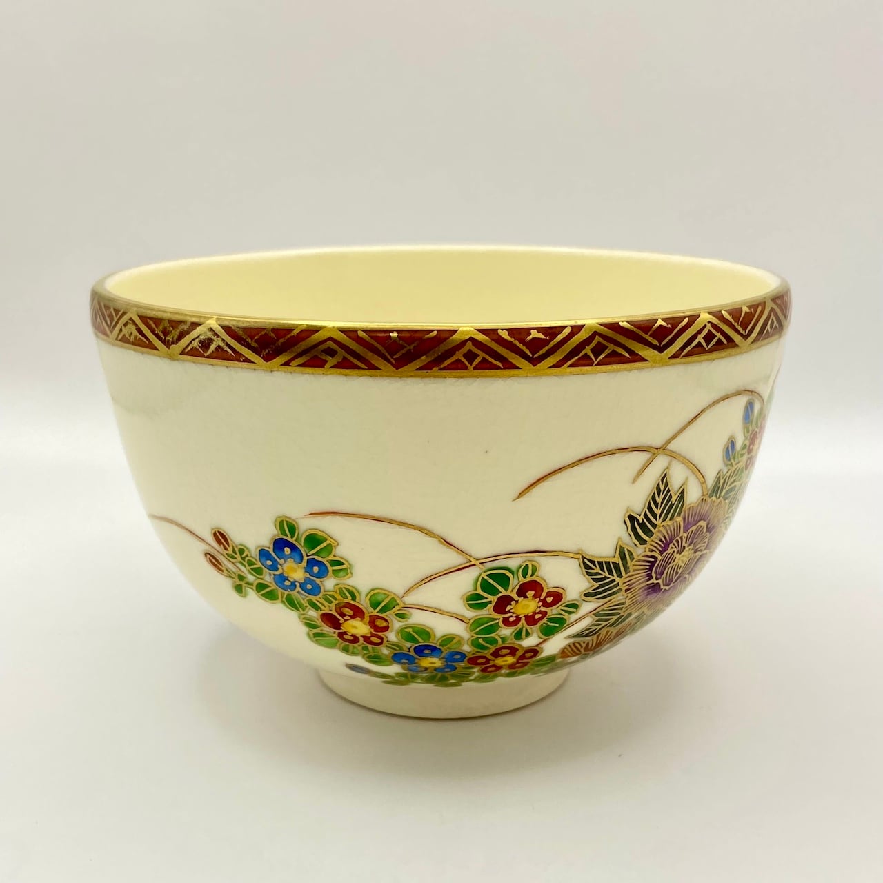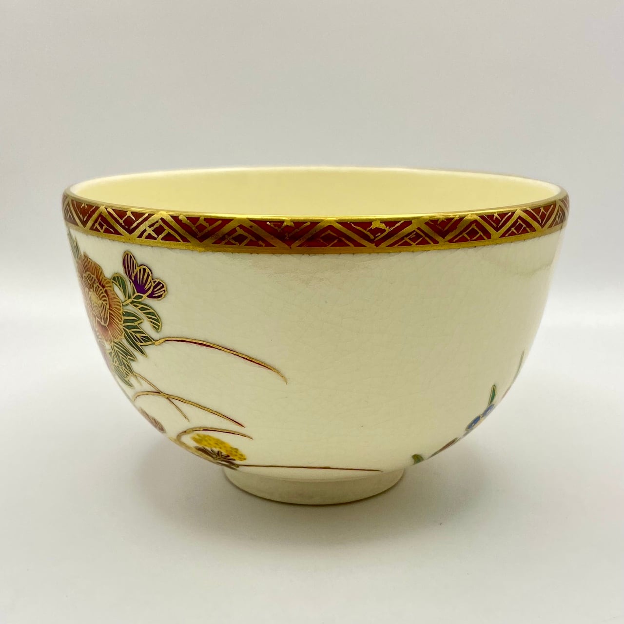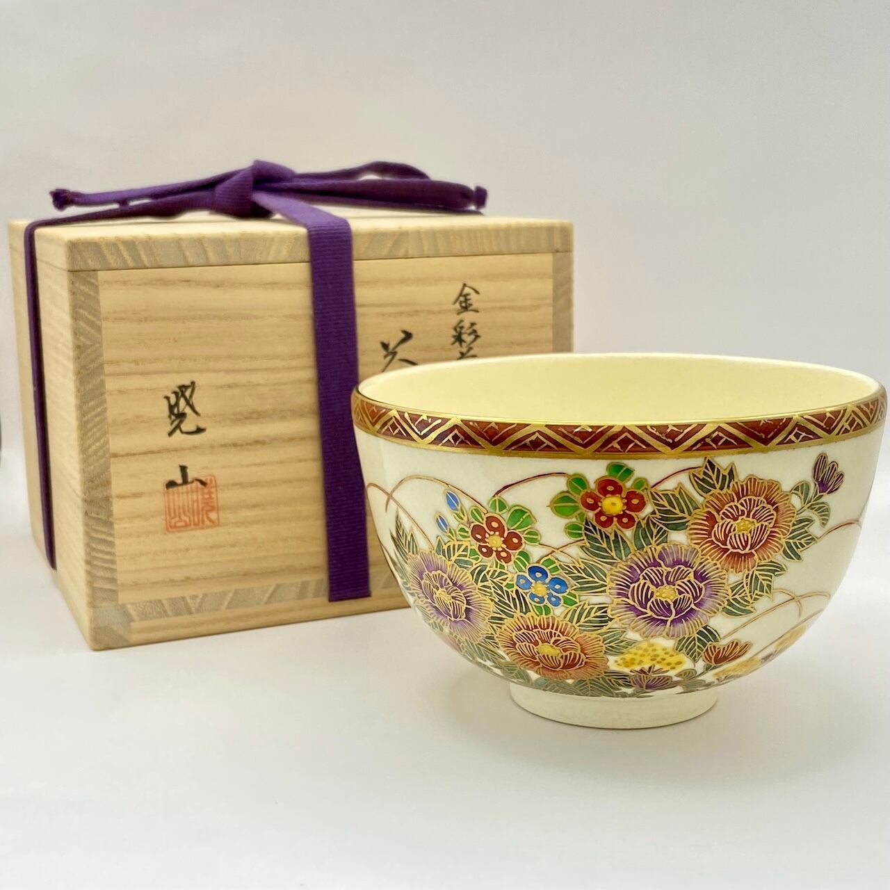 【古物】茶碗 京薩摩 金彩草花画 岡田暁山 共箱入