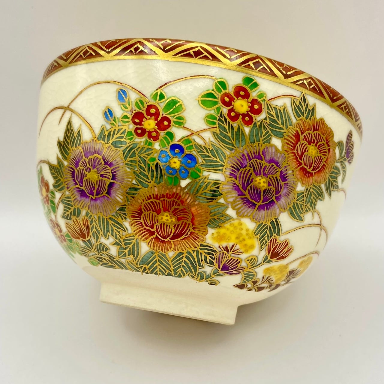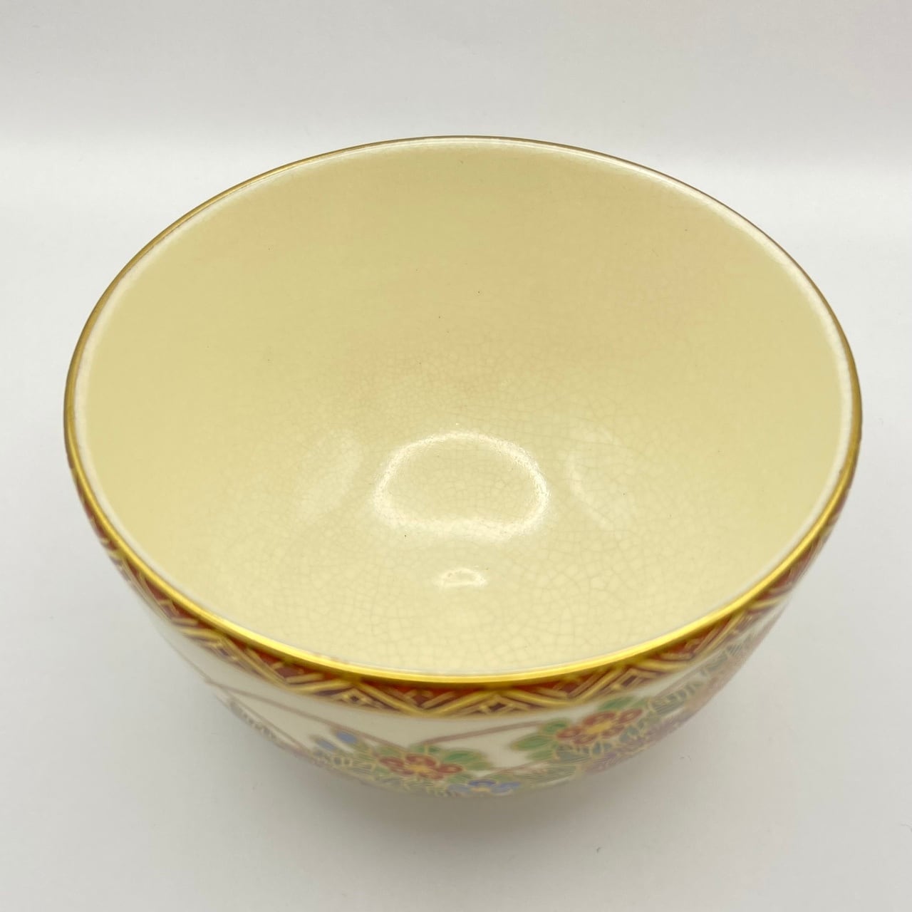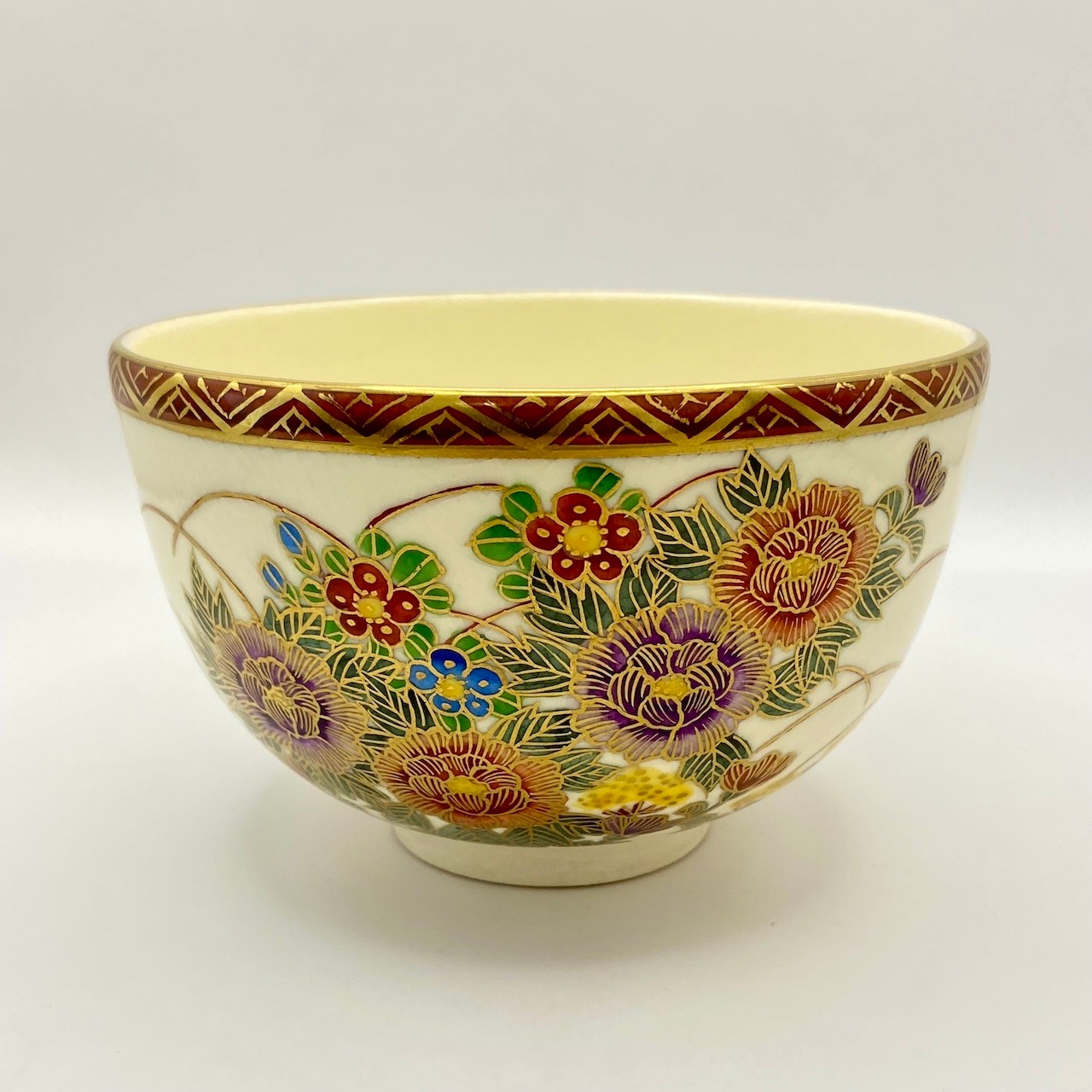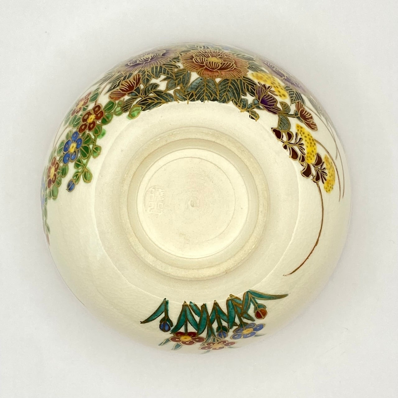 【古物】茶碗 京薩摩 金彩草花画 岡田暁山 共箱入