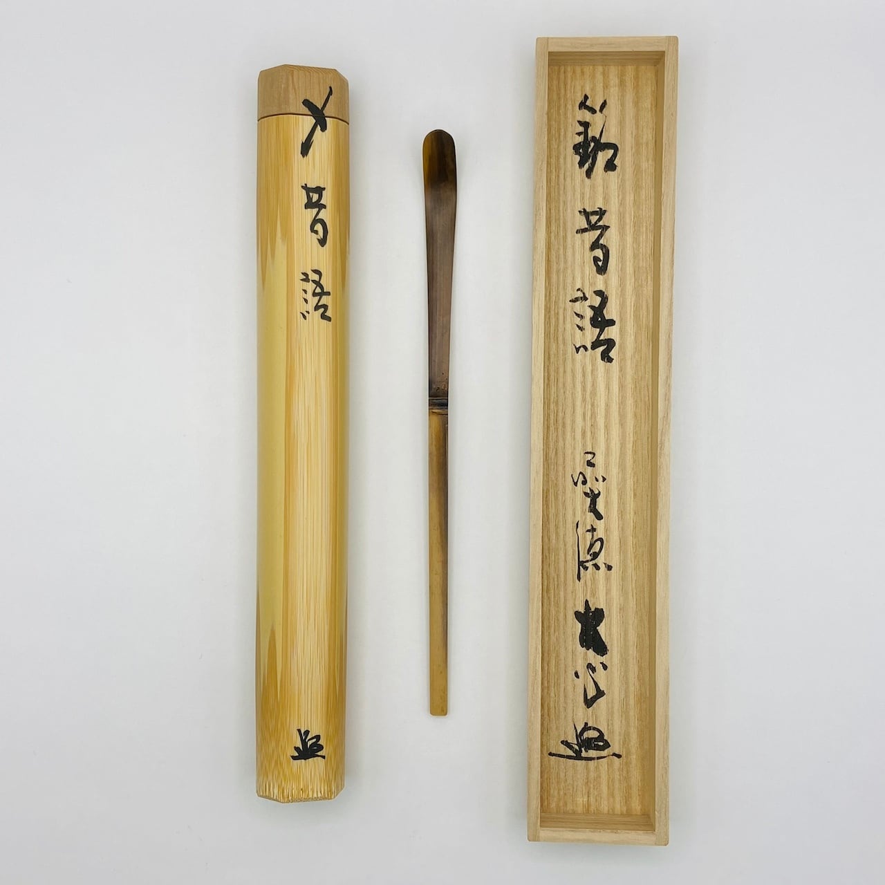 【新古】茶杓 「昔語」 小室大心師 吉田林竹作 シミ竹 共筒・共箱入